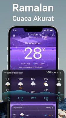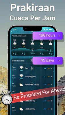 Cuaca adalah bagian tak terpisahkan dari kehidupan sehari-hari, dan kini Anda dapat menguasai setiap perubahannya dengan Prakiraan Cuaca. Aplikasi ini adalah portal akurat Anda menuju kondisi atmosfer, menyajikan informasi terkini yang diperbarui setiap jam. Dapatkan pandangan mendalam tentang cuaca hingga sebulan ke depan, memberikan Anda keunggulan dalam merencanakan aktivitas, baik itu perjalanan jauh maupun pertemuan di luar ruangan. Dukungan global memastikan bahwa di mana pun Anda berada, atau ke mana pun tujuan Anda, informasi cuaca terperinci selalu ada dalam genggaman.