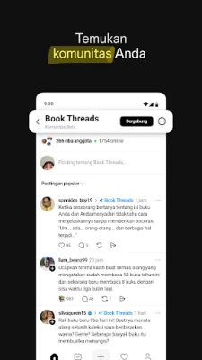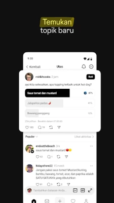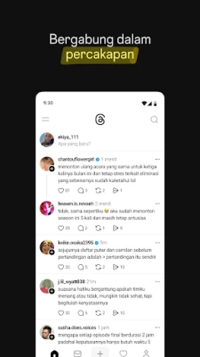 Selami diskusi terbaik dan berinteraksi aktif dengan memberikan balasan yang merangsang. Ekspresikan reaksi Anda terhadap humor, informasi, dan komentar dari sesama pengguna, sambil menemukan komunitas yang benar-benar memahami Anda. Threads juga menjadi sumber inspirasi dan pengetahuan yang tak ada habisnya; temukan jawaban atas pertanyaan Anda, pelajari hal-hal baru dari percakapan berbasis kerumunan, atau dapatkan wawasan dari para pemimpin pemikiran dan pakar industri. Jangan lewatkan satu pun momen penting; tetap terinformasi tentang tren terpanas dan acara terkini melalui notifikasi dan diskusi yang terus berkembang dari profil favorit Anda.