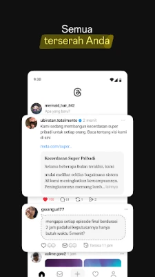 Keamanan dan kenyamanan Anda adalah prioritas utama. Dengan Threads, Anda memiliki kendali penuh atas pengalaman Anda. Sesuaikan pengaturan privasi Anda, kelola siapa saja yang dapat melihat konten Anda, membalas utas Anda, atau menyebut Anda. Akun yang telah Anda blokir di Instagram akan secara otomatis disinkronkan, memastikan lingkungan interaksi yang aman dan otentik. Kami juga menerapkan Panduan Komunitas yang sama untuk menjamin pengalaman yang positif bagi semua orang.
