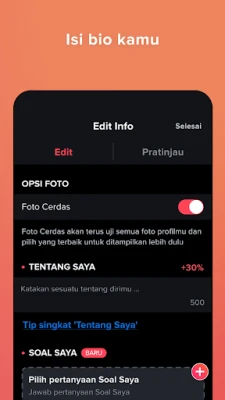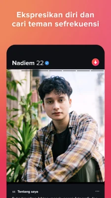 Di tengah dunia yang terus berputar, menemukan koneksi yang bermakna adalah sebuah perjalanan unik. Tinder hadir sebagai platform di mana setiap individu bisa menjadi diri sendiri secara otentik. Apakah kamu menemukan ketertarikan pada lawan jenis, sesama jenis, biseksual, atau di antara spektrum lainnya, di sini kamu bisa mengekspresikan identitasmu dan menemukan orang yang tepat untuk hubungan apa pun yang kamu cari. Bagikan minatmu, gali lebih dalam tentang orang yang kamu incar untuk memulai percakapan yang menarik, dan rasakan getaran awal dari sebuah potensi koneksi. Dengan fitur verifikasi foto profil, kejutan yang kami inginkan hanyalah buket bunga di kencan pertamamu.