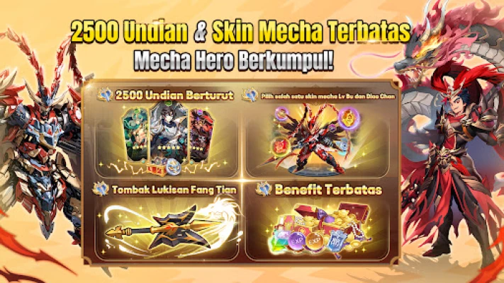Petualangan Anda di dunia Fantasi Tiga Negara diperkaya dengan serangkaian hadiah luar biasa sejak awal. Bersiaplah untuk mendapatkan 2500 undian berturut-turut, kulit pahlawan edisi terbatas, senjata legendaris Tombak Lukisan Fang Tian yang perkasa, serta harta Ingot yang melimpah untuk mendukung perjalanan Anda. Hadiah-hadiah ini dirancang untuk memberikan pengalaman bermain yang luar biasa, memastikan Anda memiliki semua yang dibutuhkan untuk menghadapi setiap tantangan. Dengan strategi yang fleksibel dan beragam fitur unik, ini adalah kesempatan Anda untuk membuktikan kehebatan dan mendominasi era Tiga Negara.